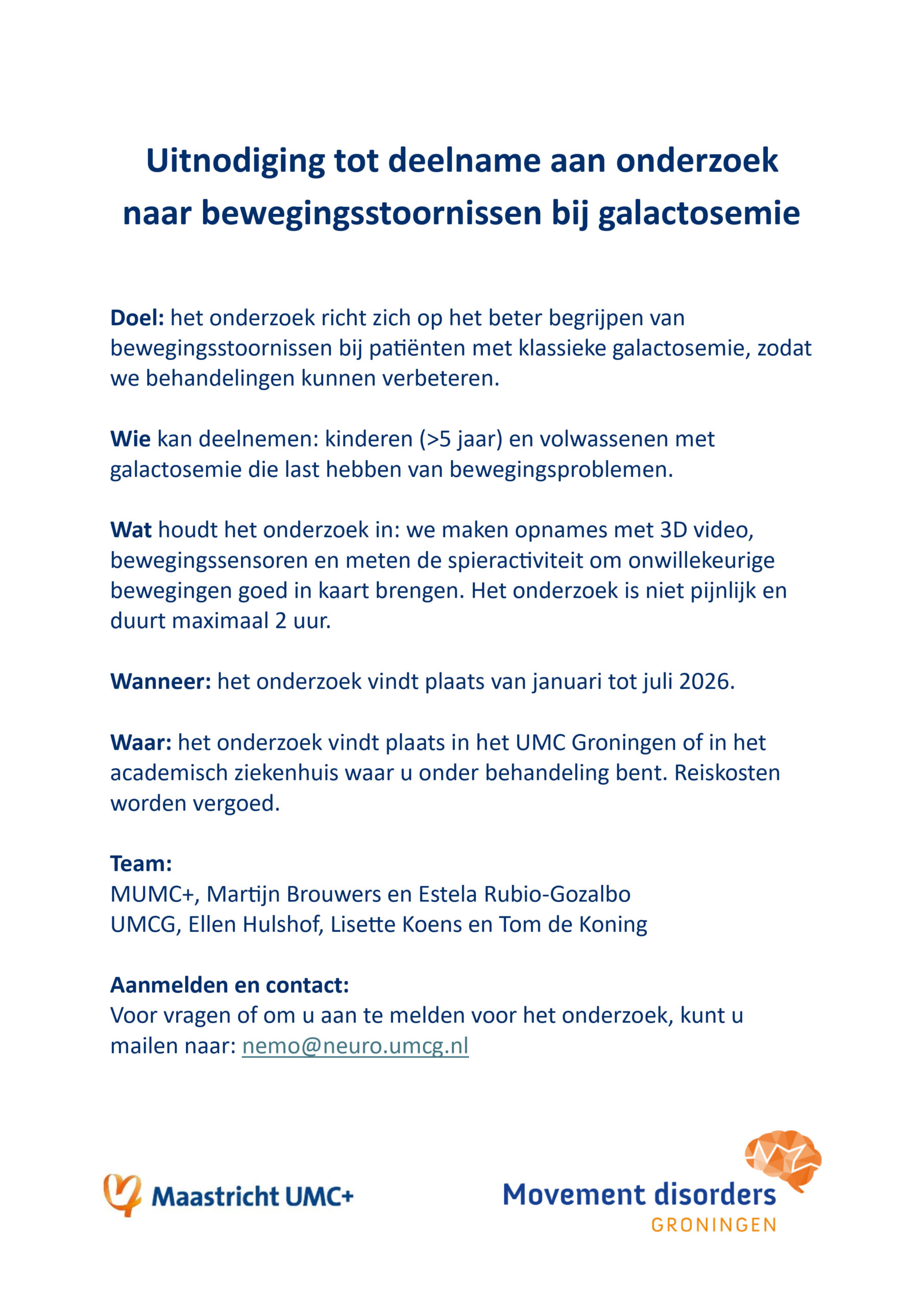 Er loopt een nieuw onderzoek waarvoor aanmelden nu mogelijk is. Zie onderstaande flyer voor meer informatie. Vragen en aanmelden kan door te mailen naar: nemo@neuro.umcg.nl